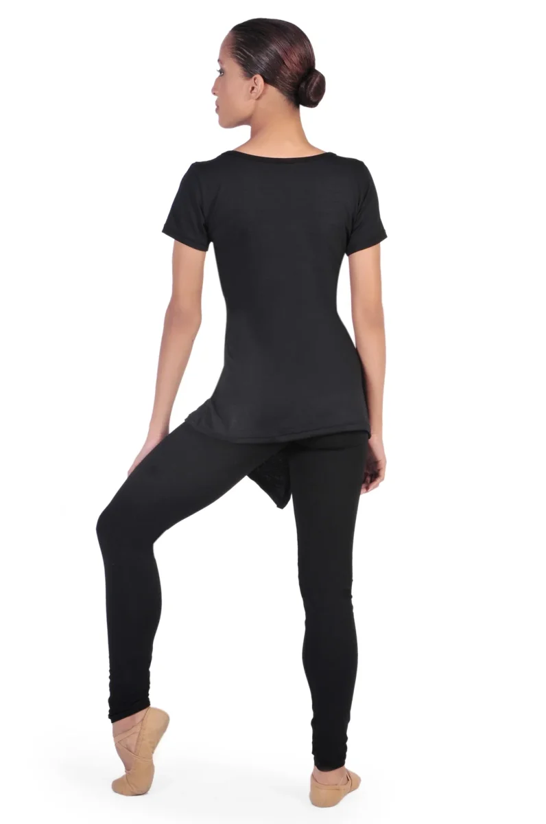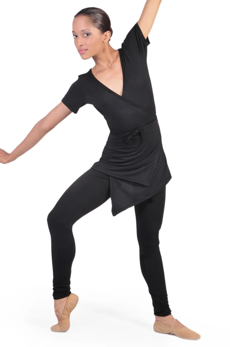 Élégante comme un kimono, confortable comme une robe de chambre, cette tunique croisée se noue à la taille avec un cordon du même tissu très léger et crée un mouvement asymétrique intéressant à l’ourlet avant ; les manches courtes la rendent adaptée à toutes les saisons, elle convient également comme uniforme pour les enseignants et les danseurs de style moderne et contemporain.