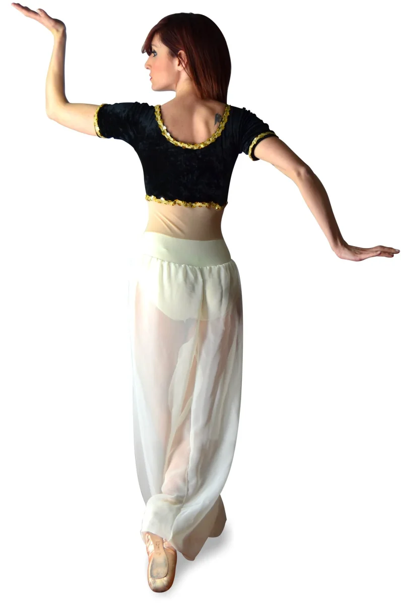 Un design qui capture l’essence de la danse : le justaucorp en velours à manches courtes est assorti d’un insert en résille couleur chair sous la poitrine et d’une culotte en lycra. Les pantalons en voile à la odalisque, ornés de bordures en passementerie dorée, créent un mouvement fluide et harmonieux à chaque pas.
